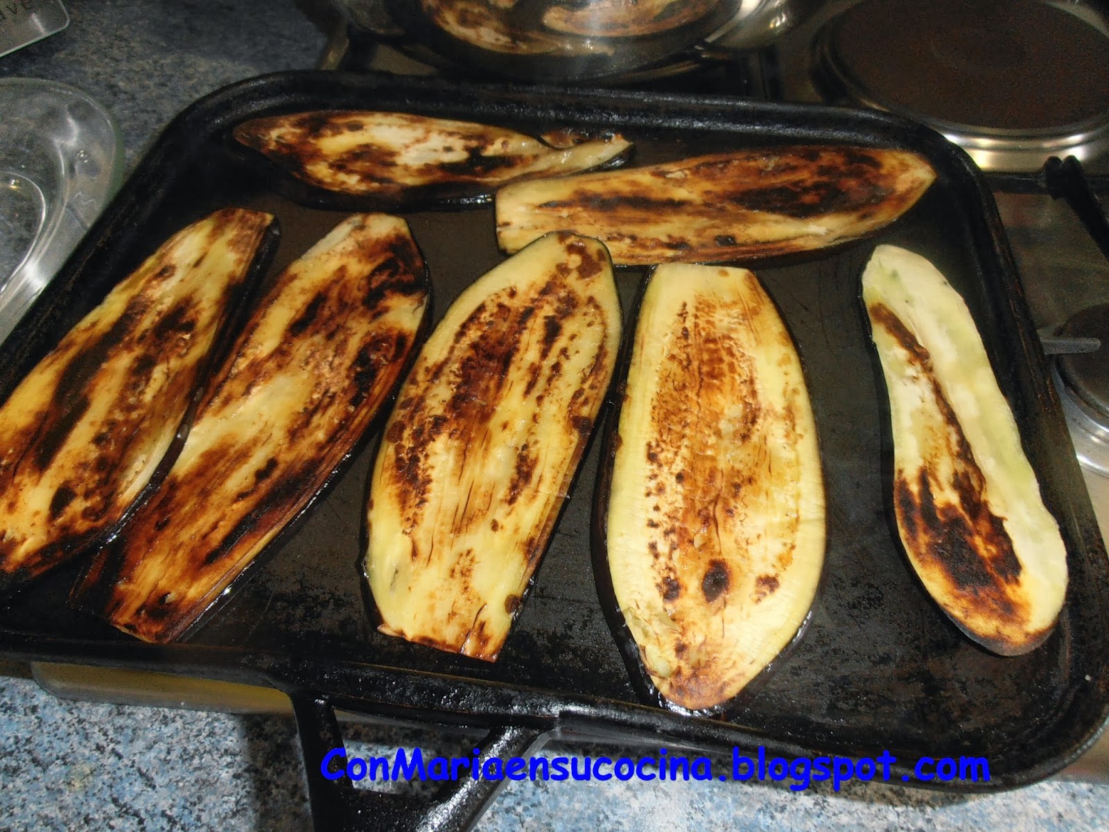 - A la par que vamos cocinando la carne podemos ir asando las berenjenas. Primero las habremos lavado y secado a conciencia y sobre una sartén o sartén amplia bien caliente las iremos dorando sin que se solapen. Es decir, que no se pongan unas sobre otras para que se doren por igual por todas partes. A fuego bastante fuertecito. Las vamos haciendo por tandas porque no nos van a caber de una vez. Según van saliendo de la planchas las colocaremos en una bandeja y las reservamos.